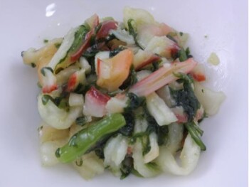 ホッキガイのヒモを大根と春菊と和え、からしを合わせた一品です。爽やかな春菊と、ツンと香るからしの風味をお楽しみいただけます。