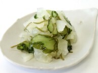だいこん、きゅうり、こんぶ、で盛り付け時に鮮やかさを演出し、ゆずの外皮をいれることで清涼感を出しています。爽やかさの中にこんぶの旨みをきかせ、常温保管でもフレッシュな色調がお楽しみいただけます。
